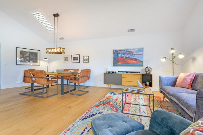 Der größere Wohnbereich liegt zentral in der Mitte des Hauses. Helle Wände und hochwertige Möbel geben dem Raum Größe aber dennoch Gemütlichkeit. Er bietet mit einer 3er – 2er Eckcouch sowie Sesseln Platz für gemütliches Beisammensein, einen Spieleabend oder als Leseecke. Ein 65´´ Zoll TV-Gerät mit Bose Soundbar & Bass Booster bietet Gelegenheit für gemütliche Fernseherlebnisse.