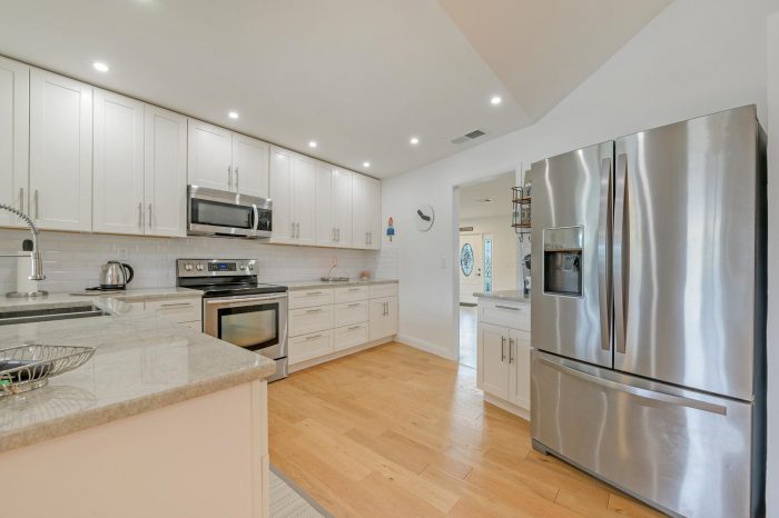 Die weiße Küche mit Granit-Arbeitsplatten ist komplett ausgestattet und lädt zum gemeinsamen Kochen ein. Sie finden alle elektrischen Geräte, Gläser, Geschirr und Kochutensilien in mehr als ausreichender Menge vor. Sie haben direkten Zugang zum großen Essbereich, der zur Kommunikation über die Bereiche hinaus anregt.