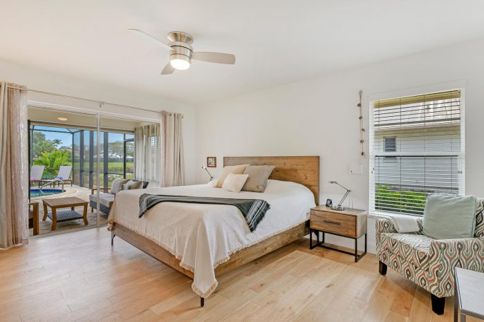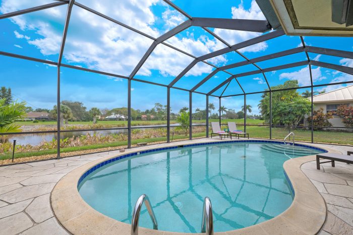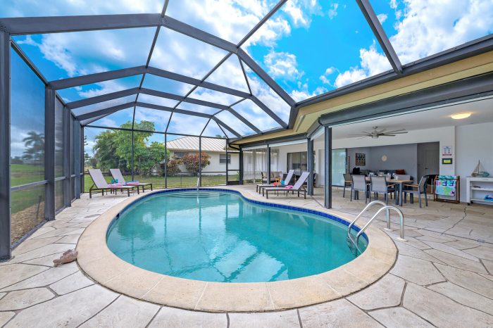 Ein großer, mit einer Lanai eingefasster Poolbereich erstreckt sich über fast die gesamte Rückseite des Hauses. Sie finden hier einen Esstisch mit 6 Stühlen, ausreichend Sonnenliegen, den großen, solar- und elektrisch beheizbaren Pool sowie eine Loungegruppe mit 2-Sitzer und 2 Sesseln zum direkten Sonnen oder Entspannen.