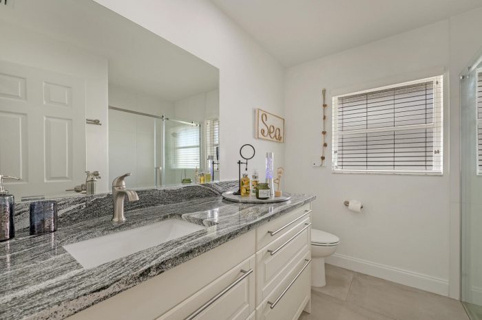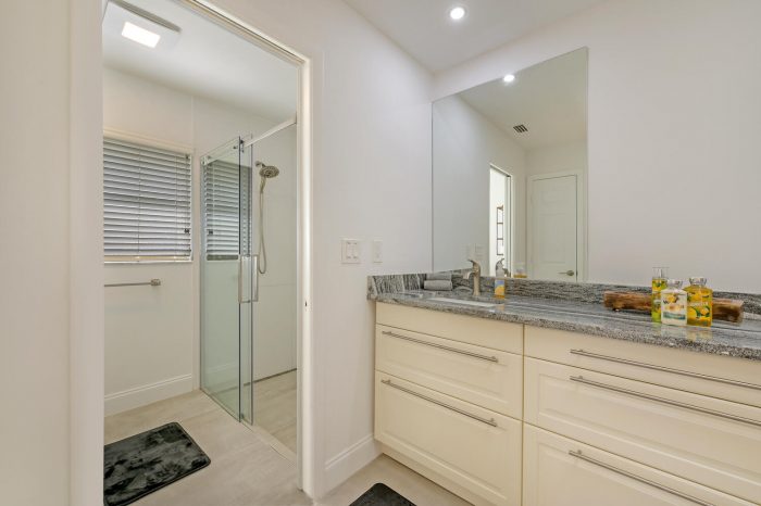 Angeschlossen ist das Master Bad mit begehbarer Dusche, einem großen Waschtisch mit vielen Schubladen und Toilette.