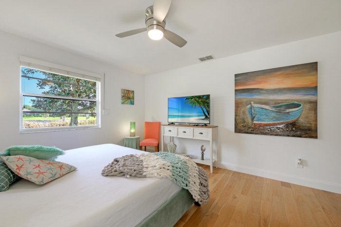 Der geräumige Master Schlafraum hat ein Kingsize Bett, eine große Kommode und zwei Nachttische mit Leuchten. Zusätzlich finden sich einige Sitzgelegenheiten.