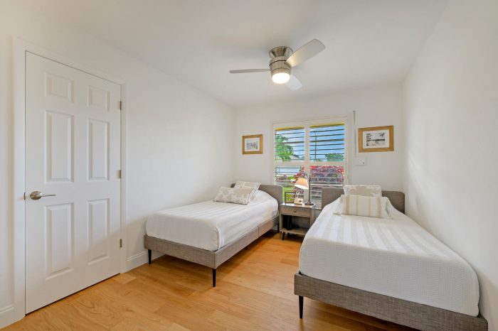 Ein weiteres separates Gäste Zimmer mit Twin-Betten, einer Kommode und einem kleinen Einbauschrank vervollständigt die Schlafbereiche. Darüber hinaus finden Sie ein geräumiges drittes Bad mit Duschwanne, Waschtisch und einem weiteren WC.