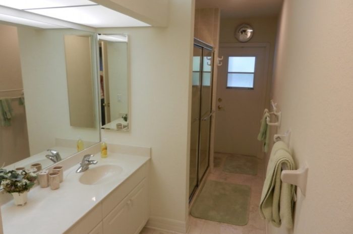 Ihr Gäste-/Poolbadezimmer verfügt über eine begehbare Dusche, einen Vanity Waschtisch, Toilette und hat direkten Zugang auf die Terrasse und an den Poolbereich.